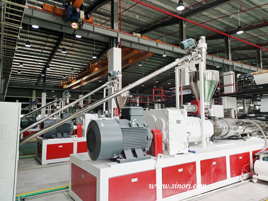 擠出基材后熱敷彩膜裝飾層和耐磨層,以及底部的軟墊隔音層,實現(xiàn)多層復合一步法在同一臺設備上完成。